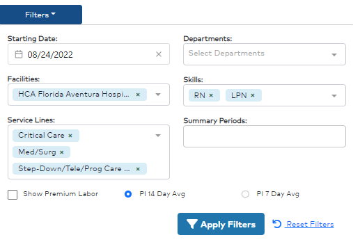 Filters allow the user to select facilities, service lines, and departments to view. Filter selections are determined by the user’s access. The filter Starting Date defaults to tomorrow’s date. Skills are based on the skill groups displayed on the Aggregated Skills Dashboard rather than individual skills. You can choose up to 3 skill groups.