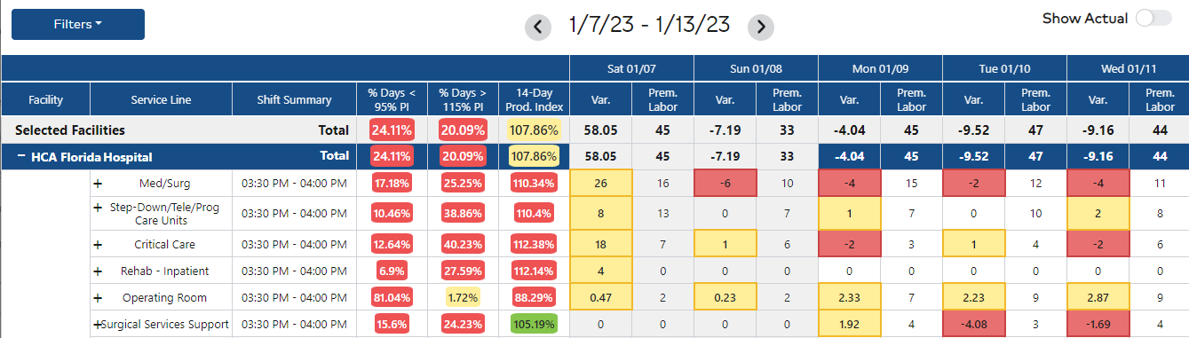 The default view displays staffing variance (Target - Actual = Variance). To view actual head count, click the Show Actual toggle in the header.