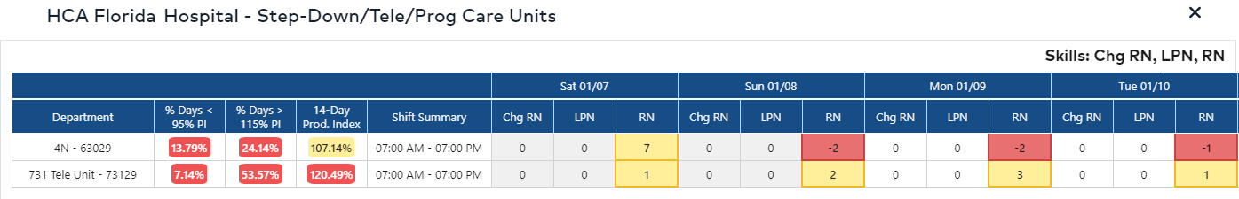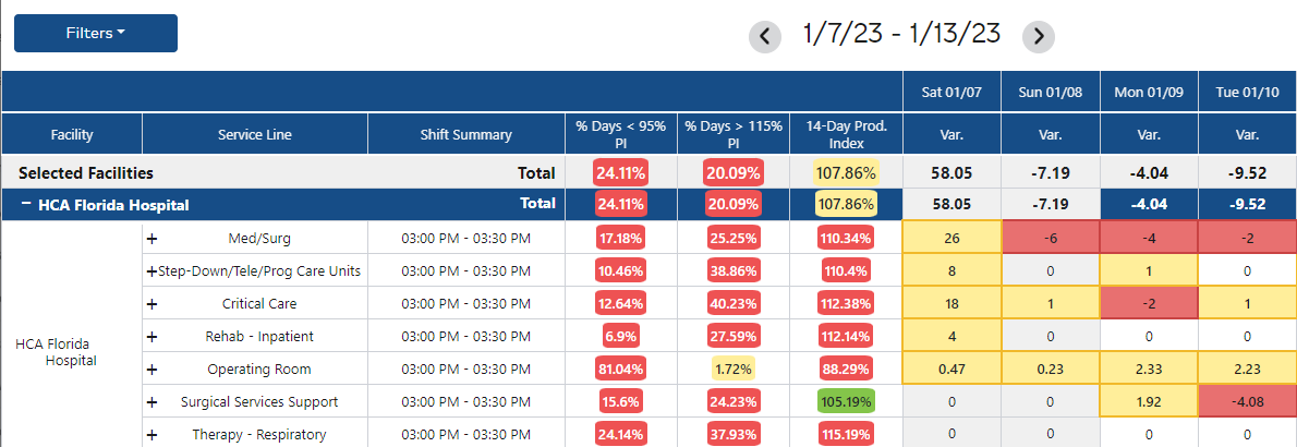 The 7-day view includes metrics such as the Productive Index, which is the number of target hours divided by the number of actual hours x 100. Productive Indexes under 100% indicate over staffing.